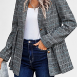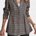 Una prenda distintiva que combina estructura y feminidad. Calico destaca con un corte peplum plisado que define la cintura con gracia, mientras su diseño a cuadros aporta un aire clásico renovado. La solapa de muesca y las mangas largas completan un estilo versátil que transita con facilidad de lo profesional a lo casual chic.
