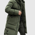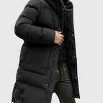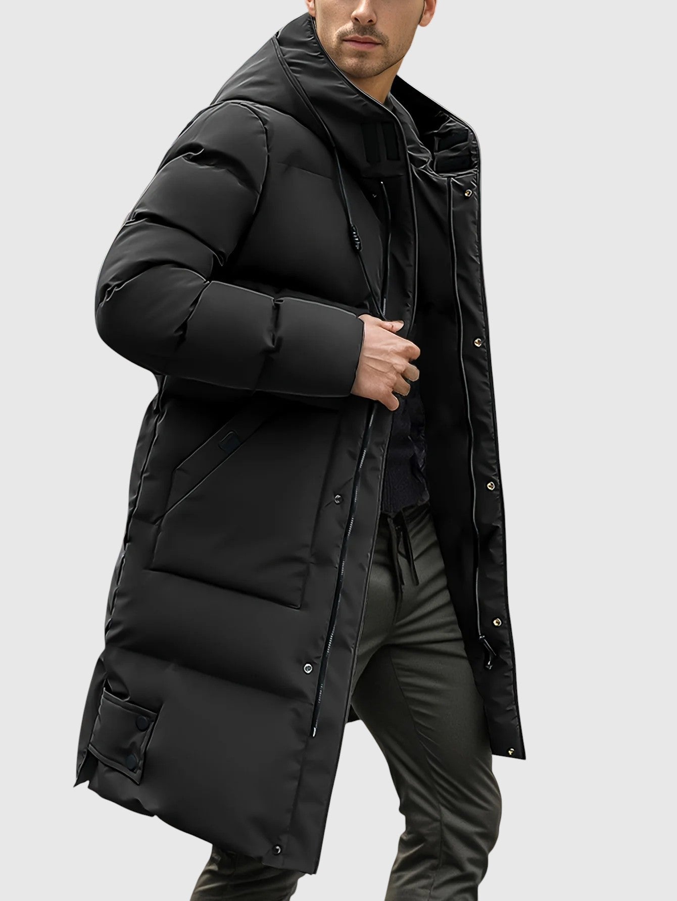 Dlouhý kabát s moderním střihem, navržený tak, aby poskytoval maximální ochranu a pohodlí v chladných dnech. Prošívaná výplň zajišťuje účinnou izolaci, zatímco kapuce a vysoký límec posilují ochranu proti větru a nízkým teplotám. Funkční kapsy a zapínání na knoflíky dodávají praktičnost elegantnímu designu, díky čemuž je tento kousek univerzální pro městský život i volný čas.