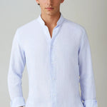 Světle modrá lněná košile s bandovým límcem od Grand Arbre je pečlivě vyrobena a splňuje nejvyšší standardy. Nabízí dokonalou rovnováhu mezi pohodlím, stylem a funkčností a je nezbytností pro moderního muže.