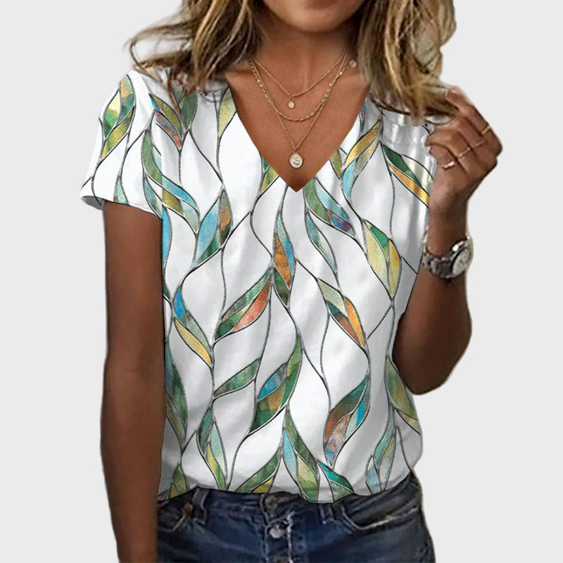 Destaca el lado moderno de tu estilo con esta blusa de base blanca, decorada con patrones ondulados multicolores en tonos de verde, azul claro y dorado. El escote en V añade un toque femenino, mientras que el corte holgado ofrece comodidad y elegancia para cualquier ocasión.