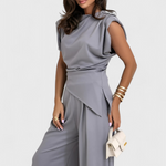 Elegancia escultural con un toque moderno: el conjunto Sofia combina un top asimétrico con pantalones de pierna ancha para una silueta que estiliza y fluye con gracia. Perfecto para ocasiones especiales o para elevar tu look diario con sofisticación sin esfuerzo.