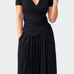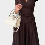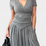 - Escote en V cruzado que estiliza y realza el busto con delicadeza