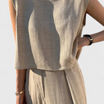 Sutil y sofisticado, el Conjunto Lauren está diseñado para ofrecer elegancia sin esfuerzo en los días más cálidos. Con un top sin mangas de corte limpio y pantalones de pierna ancha de talle alto, esta combinación fluida aporta frescura, estilo y libertad de movimiento para cada ocasión.