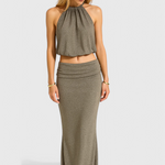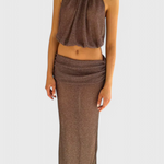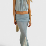 Diseñado para cautivar, el Conjunto Zhenya combina un top halter corto con una falda larga y fluida, completa con una dramática abertura lateral. Elaborado en una tela ligera y transparente que se mueve con gracia, es el look definitivo para las noches que exigen confianza y atractivo.
