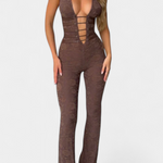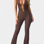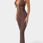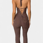 Atrevido, sensual y con un aire sofisticado, el mono Kendra redefine la silueta femenina con su diseño halter profundo y detalles de encaje floral. Su escote pronunciado con tiras frontales aporta un toque provocador, mientras que la espalda abierta con cordones ajustables asegura un fit favorecedor y personalizado. El acabado en pierna acampanada estiliza la figura, creando un look imponente y seductor para destacar en cualquier ocasión especial.