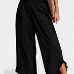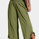 Relajado, fresco y con mucho estilo. El pantalón Justina combina una silueta ancha con un tejido de algodón-lino ligero, ideal para climas cálidos. Su cinturilla fruncida de talle alto estiliza la figura mientras que los volantes en el bajo añaden un detalle femenino y encantador. Una prenda versátil para looks de playa, escapadas o días de verano sin esfuerzo.