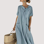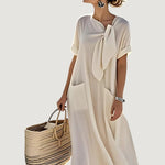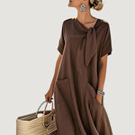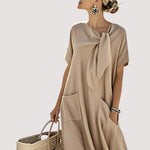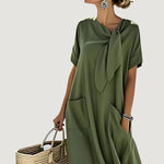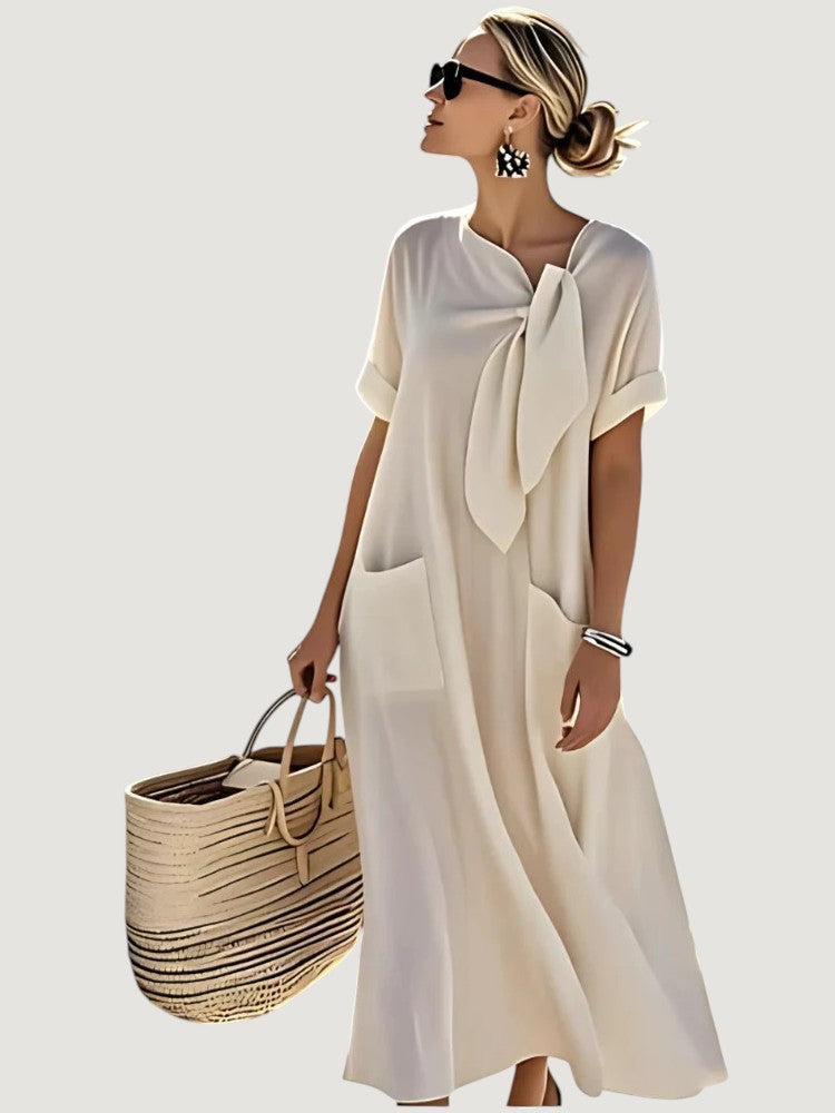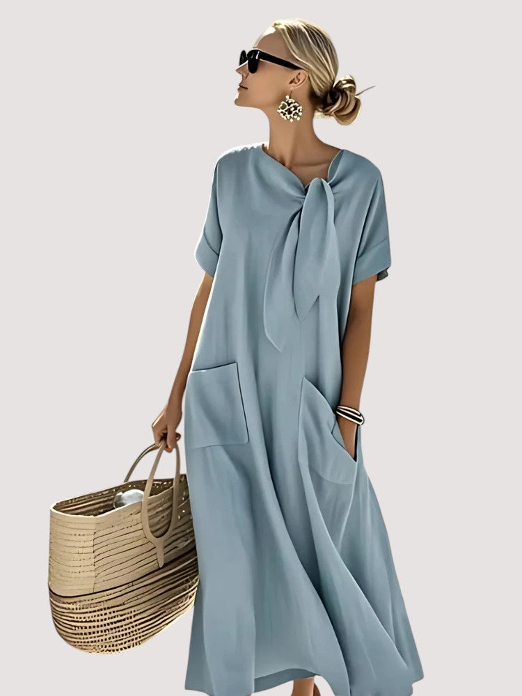Agrega un toque de encanto a tu guardarropa de verano con el Vestido Elara. Confeccionado en lino transpirable y una silueta relajada, este vestido presenta un elegante lazo en el cuello y prácticos bolsillos.