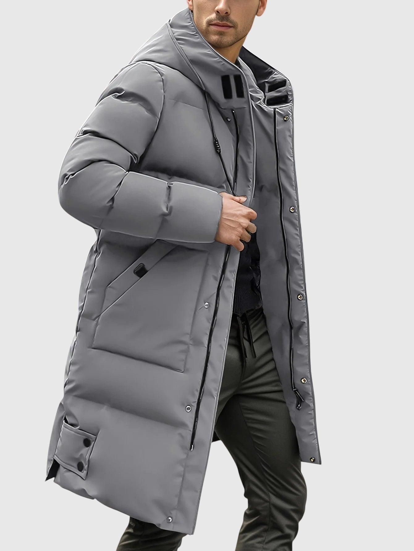 Dlouhý kabát s moderním střihem, navržený tak, aby poskytoval maximální ochranu a pohodlí v chladných dnech. Prošívaná výplň zajišťuje účinnou izolaci, zatímco kapuce a vysoký límec posilují ochranu proti větru a nízkým teplotám. Funkční kapsy a zapínání na knoflíky dodávají praktičnost elegantnímu designu, díky čemuž je tento kousek univerzální pro městský život i volný čas.